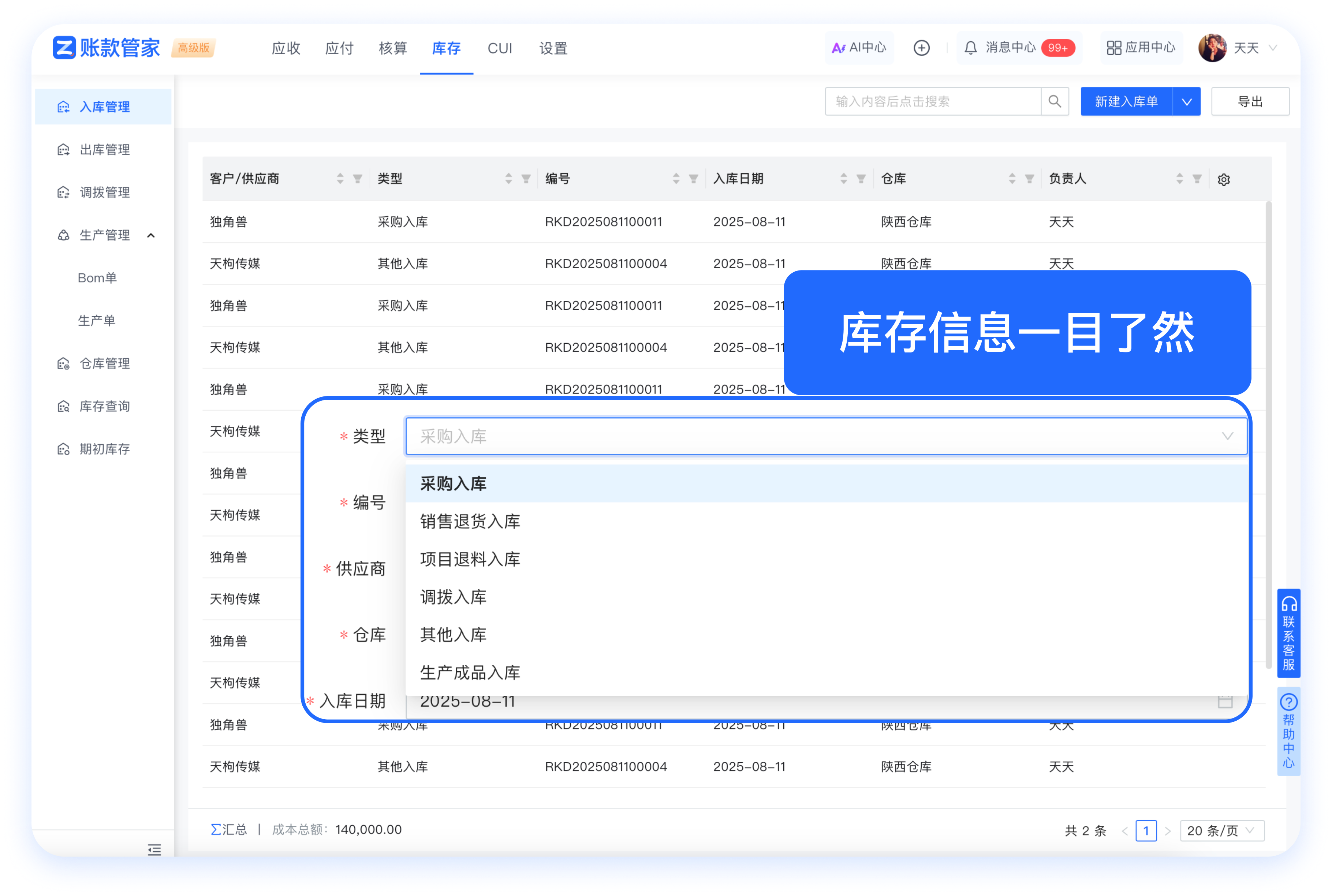 🟢 解决方案:账款管家库存管理让每一笔物料的采购、入库、领用、出库都清晰记录在案,库存数量实时更新,彻底告别了“库存黑洞”。系统能提供各类库存数据,帮助公司识别滞销品,优化库存储备,显著降低了资金占压和仓储成本。