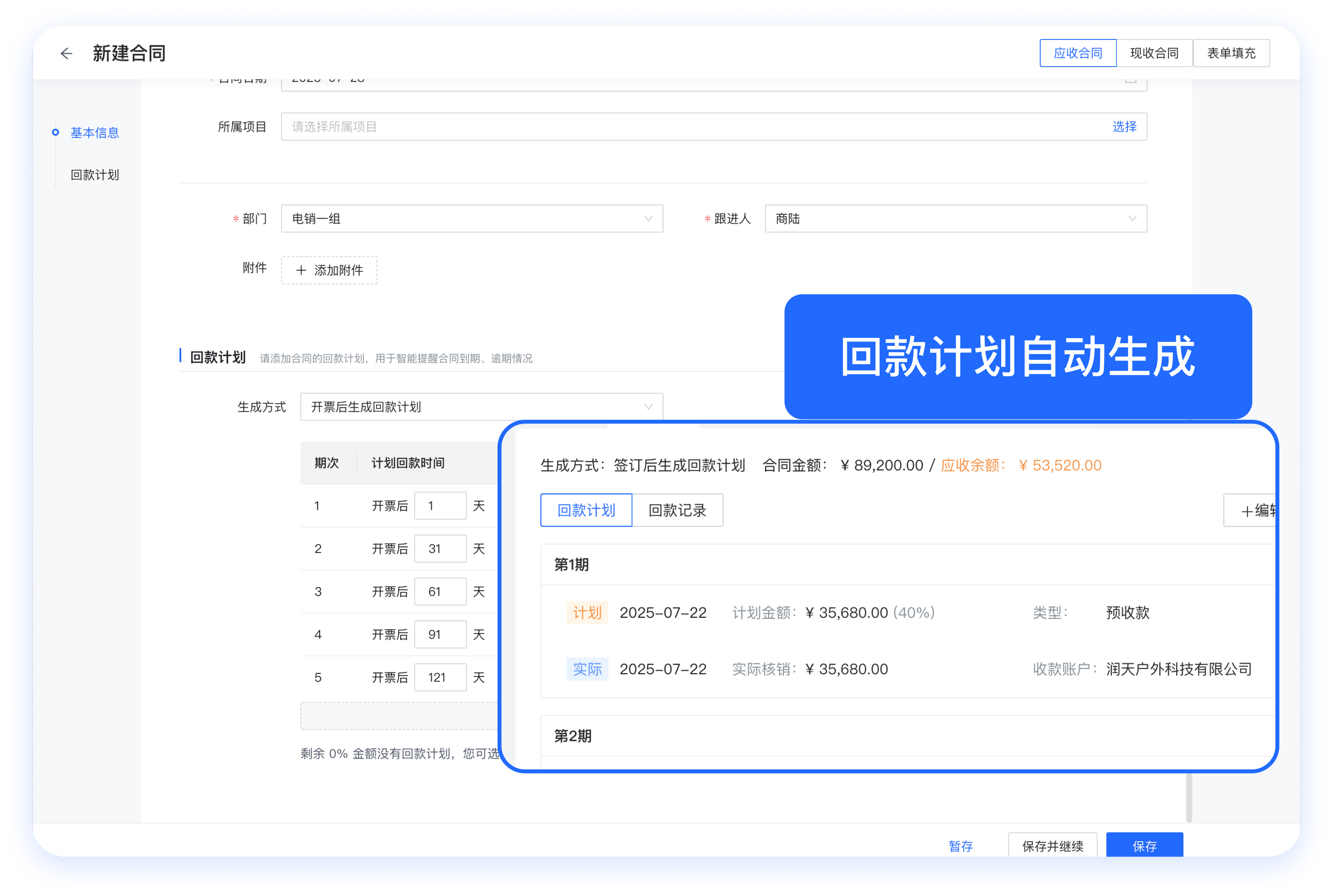 🟢 解决方案:账款管家支持根据合同约定录入回款计划,系统自动生成每一期回款金额和时间,并设置到期自动提醒。财务人员可以实时查看每笔应收款的详细状态、到账情况及逾期风险,变被动催收为主动管理,大大加速了资金回笼速度。