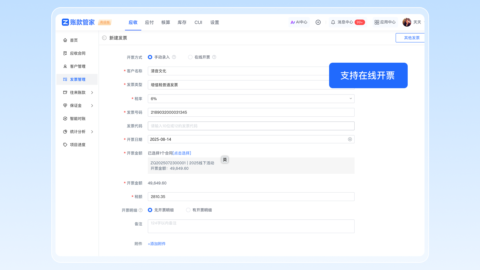 🟢 解决方案:账款管家实现了发票与合同的关联管理,能够清晰记录发票的开具情况,杜绝错误与重复。有效提升发票管理的准确性与效率,显著降低税务风险和财务损失。