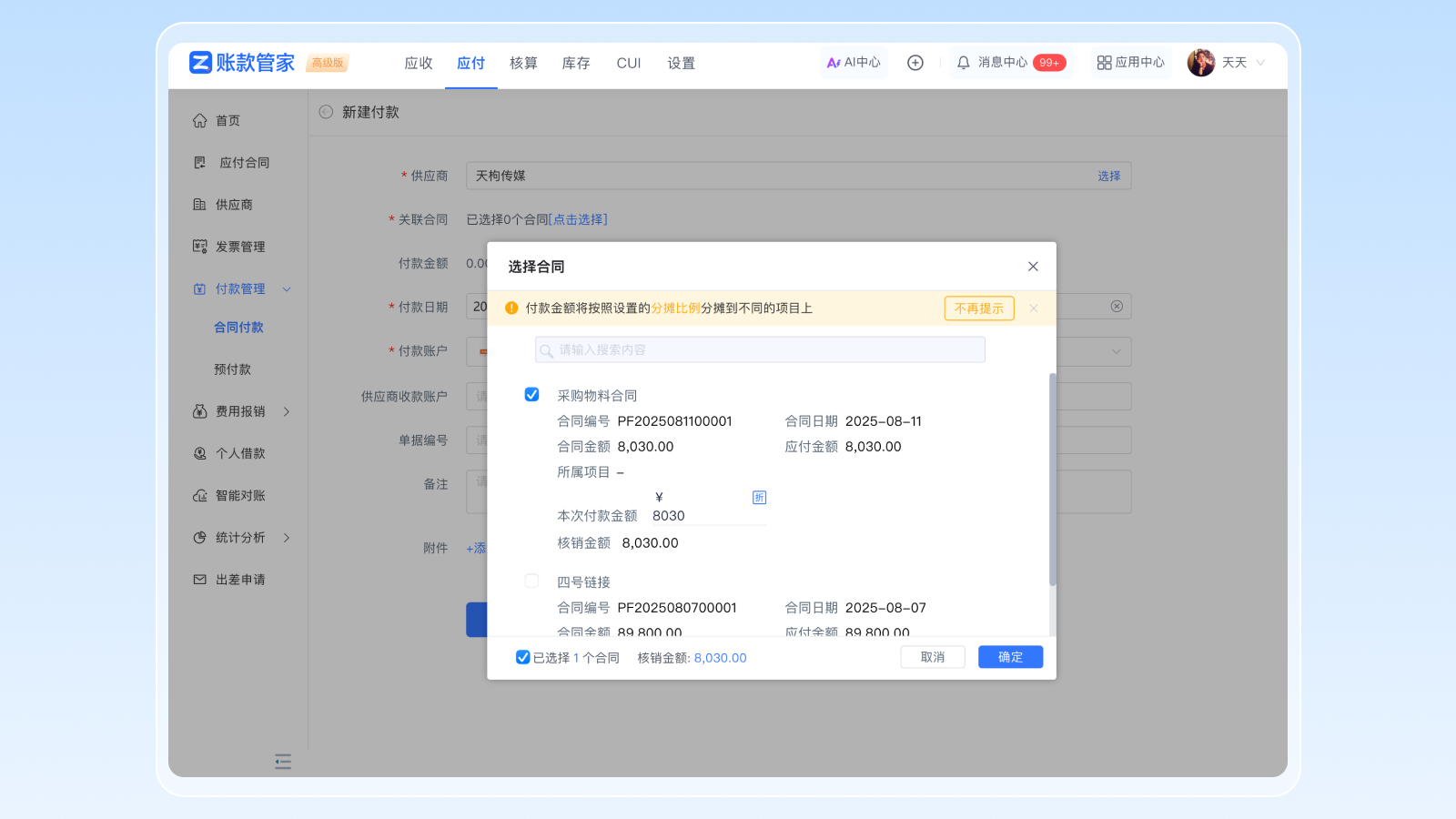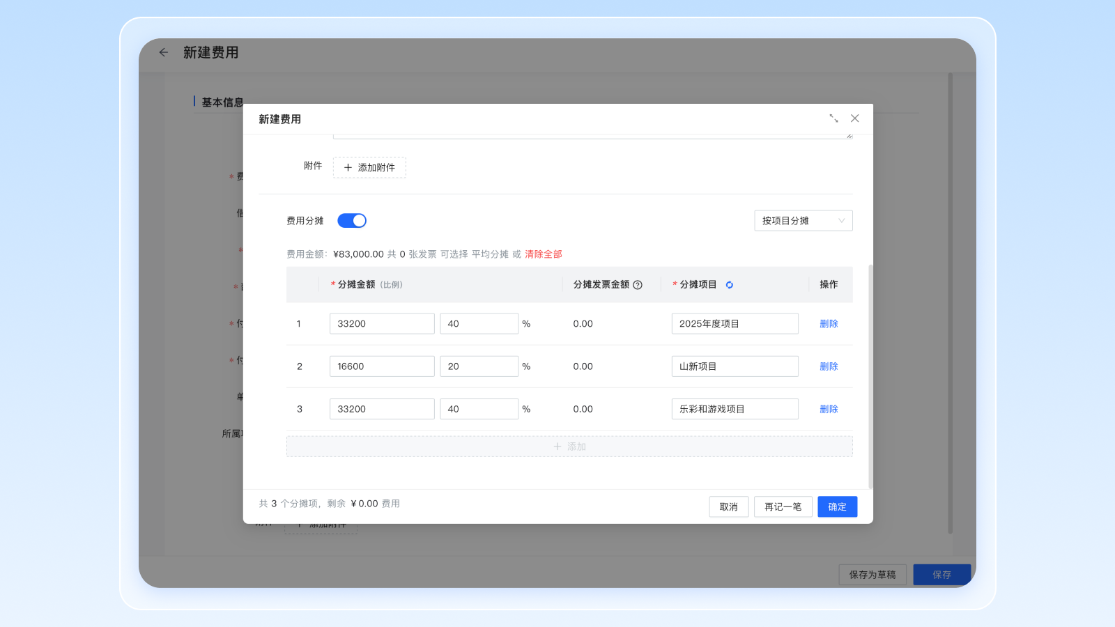 让我印象比较深刻的亮点就是员工报销中会用到的费用分摊功能。