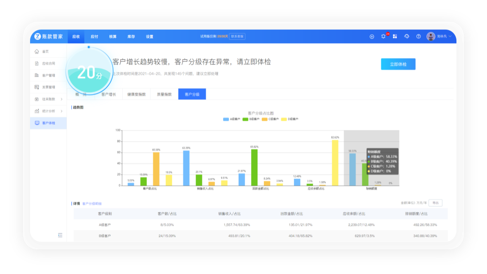 根据客户合同金额、应收金额、回款金额等对客户进行分级管理,并设置合理的赊销额度,规避风险,减少账龄,保证公司现金流稳定。