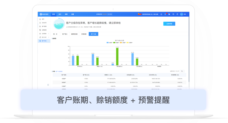 账款管家的客户体检功能,通过数据统计和大数据分析,对企业客户进行信用健康分析和等级划分,并推荐更加健康的账期和赊销额度,减少企业呆坏账,提高企业资金流转率,做好风控管理。