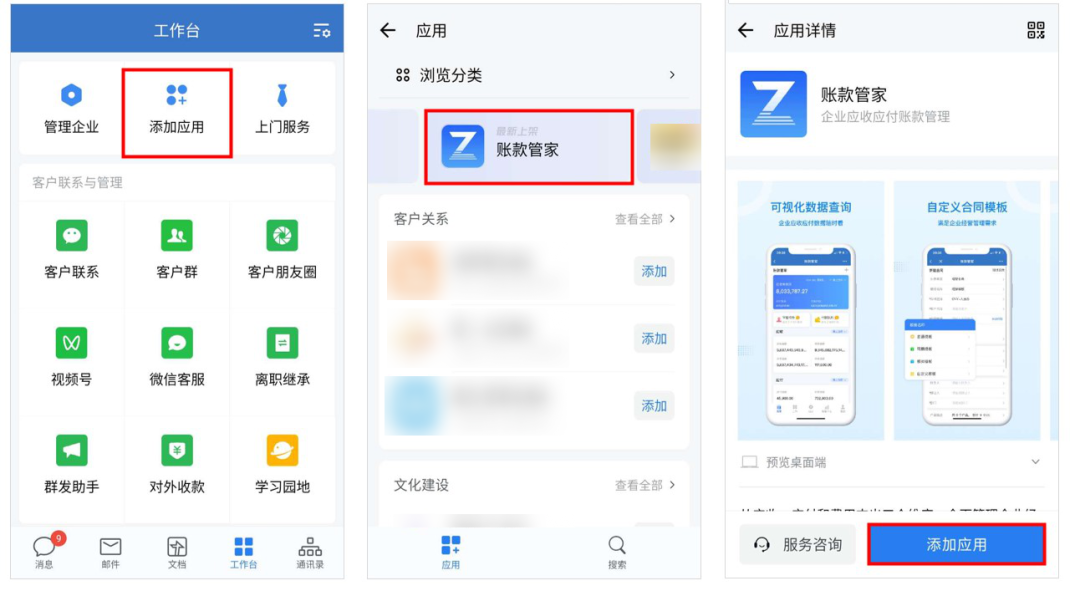 在企业微信工作台中,找到账款管家,添加应用即可。