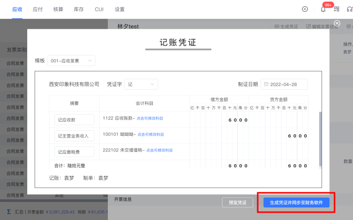 根据凭证模板可智能生成多张凭证预览,同时支持对每张凭证进行模板切换,支持修改摘要、会计科目、借贷金额,生成凭证同步畅捷通。
