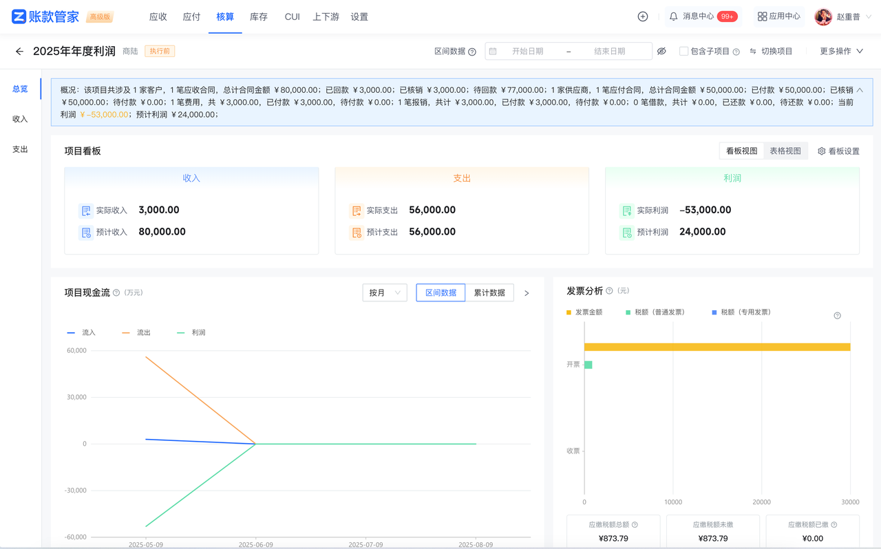 成本核算是财务管理的核心,而Excel在这方面往往会面临成本归集困难、缺乏数据穿透力等挑战。账款管家支持多维度的数据核算,包括项目核算、部门核算等。