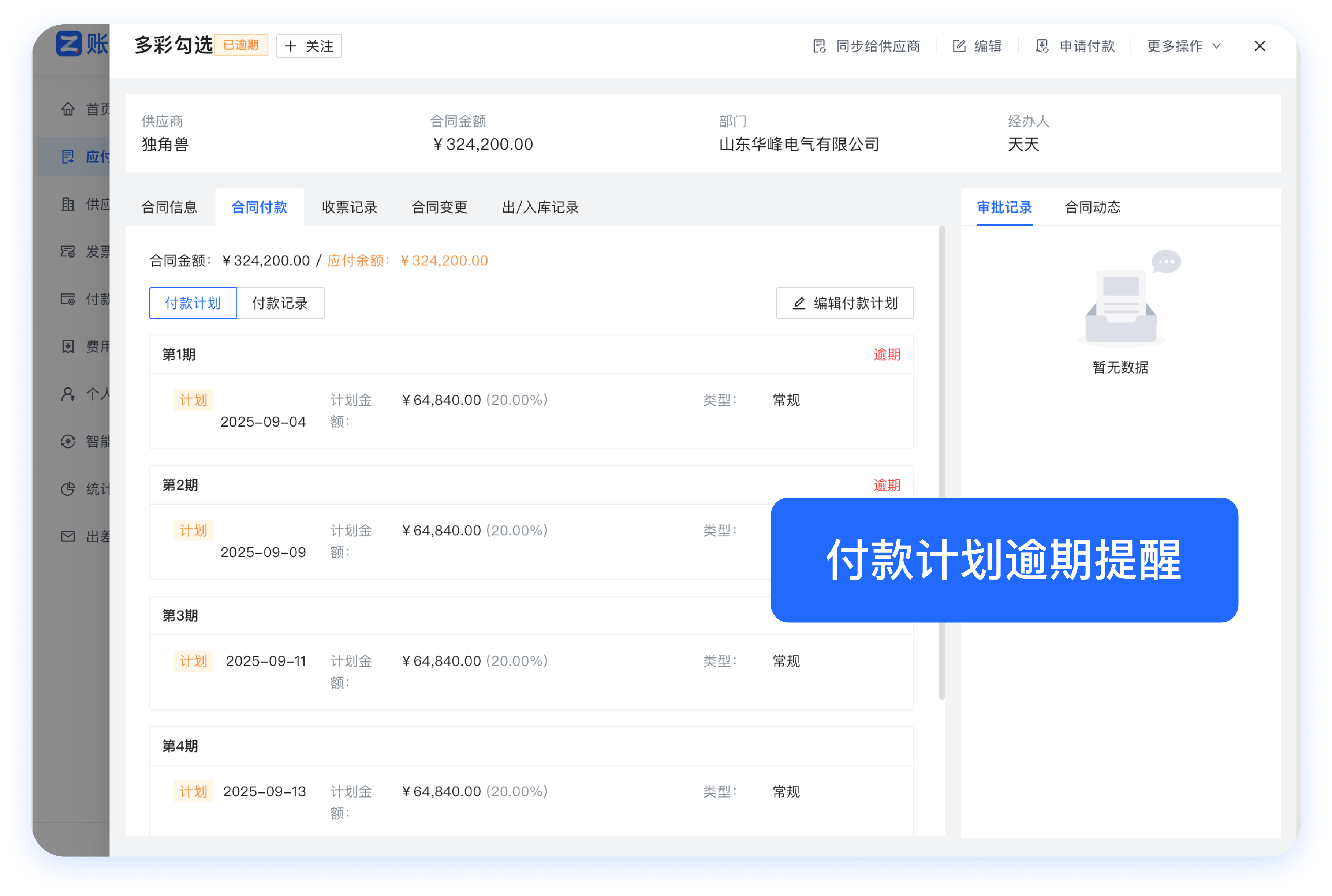 🟢 解决方案:账款管家支持根据合同约定录入付款计划,系统自动生成每一期付款金额和时间,并设置到期自动提醒。这使财务人员能及时付款,避免逾期产生的额外费用、信用损失等问题,保障企业良好的商业信用和稳定的合作关系。