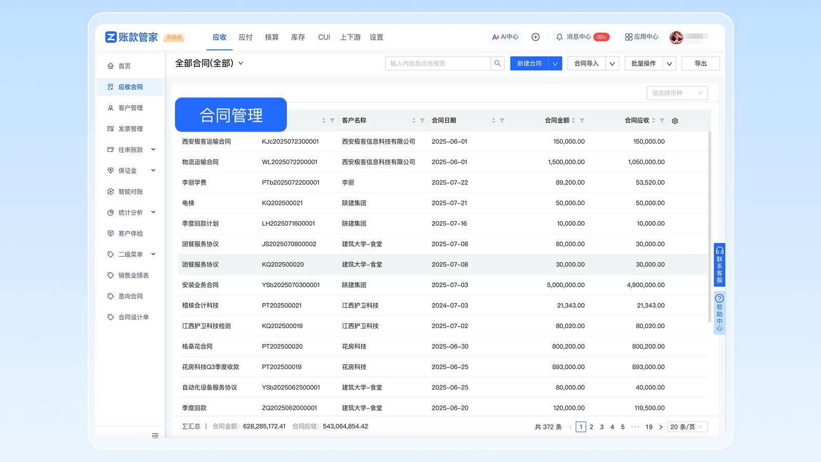🟢 解决方案:账款管家为金账本打造完善合同管理体系。它支持多类型合同模板,能详细记录合同回款、发票开具等情况。系统还可让离职人员批量移交数据,保障合同信息完整连续,有效提升合同管理效率,减少人为错误与管理成本。