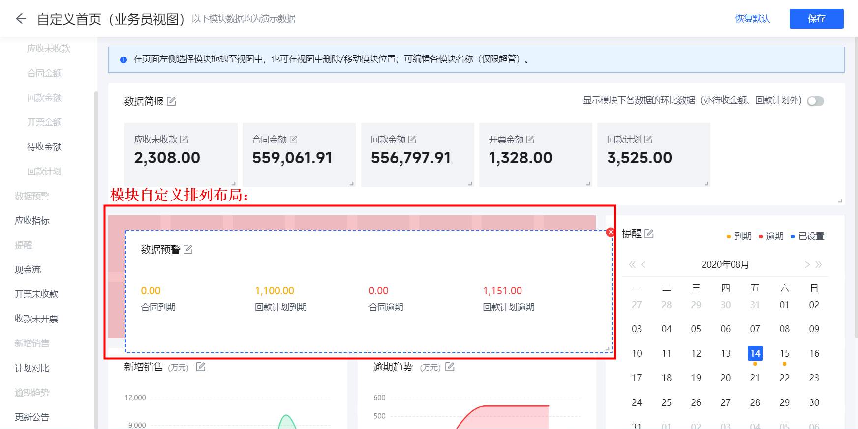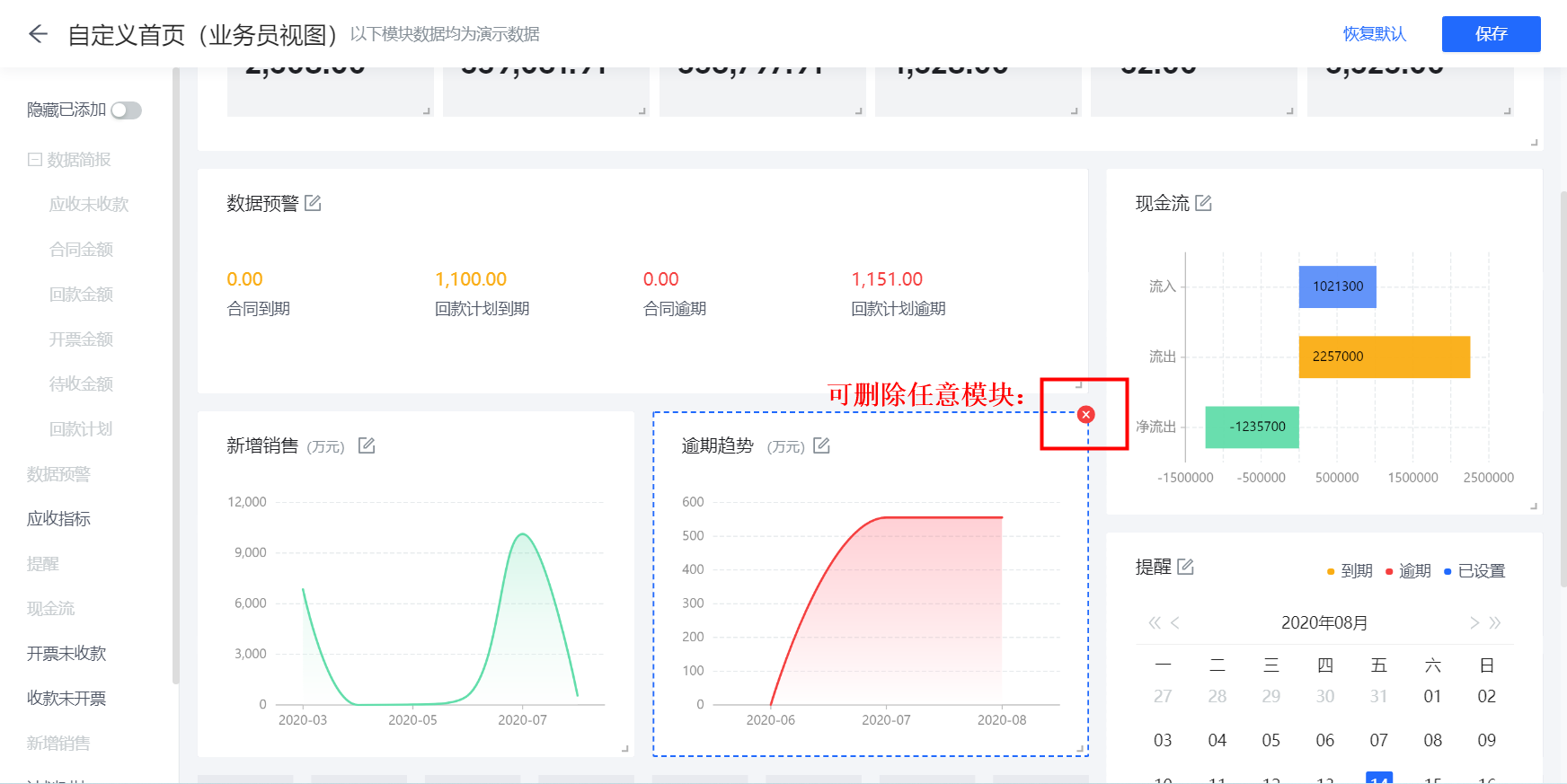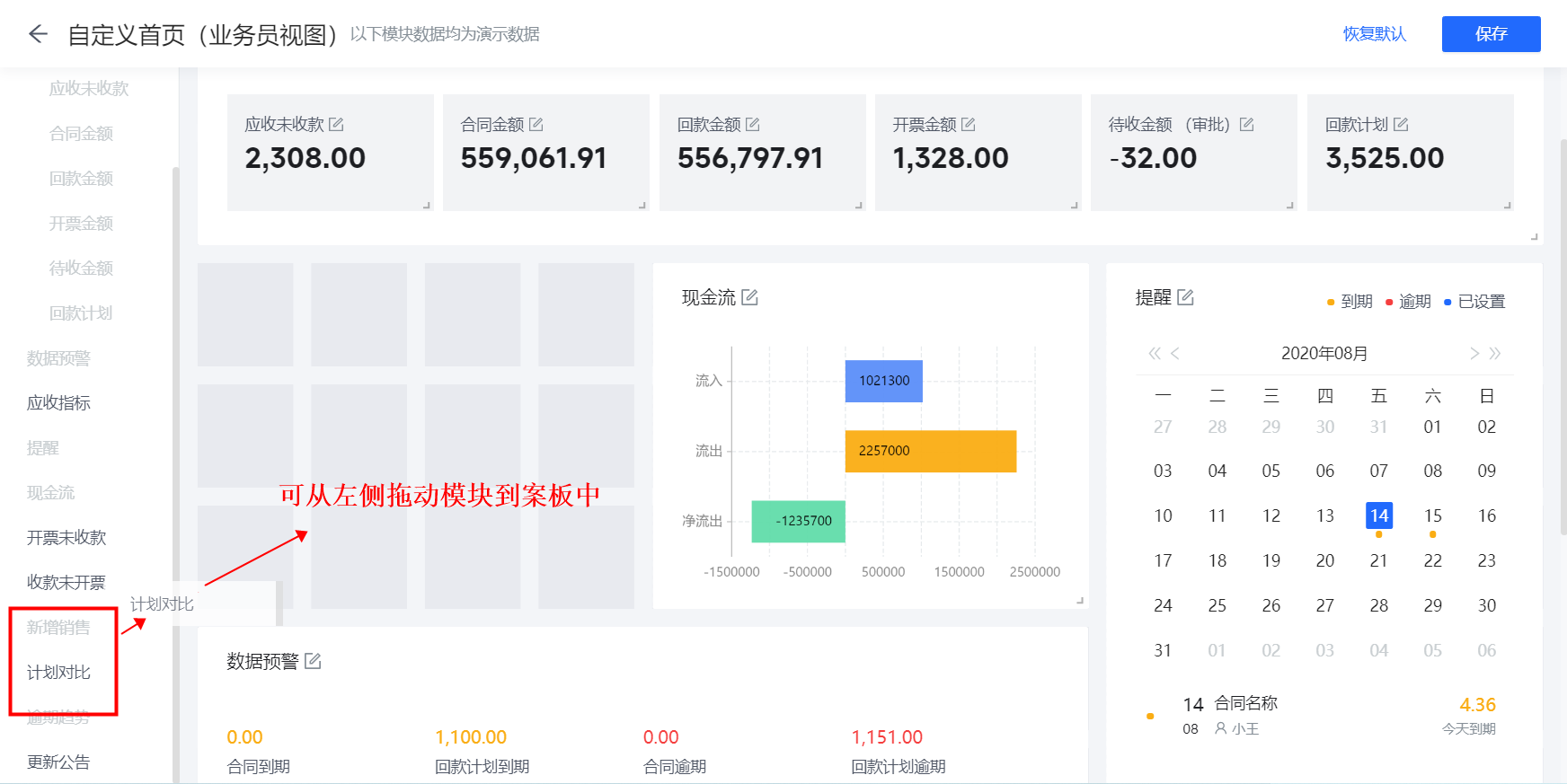 🟢场景:销售可在数据看板查看团队或个人回款数据。看板智能预警到期/逾期回款情况,助力销售精准催收。