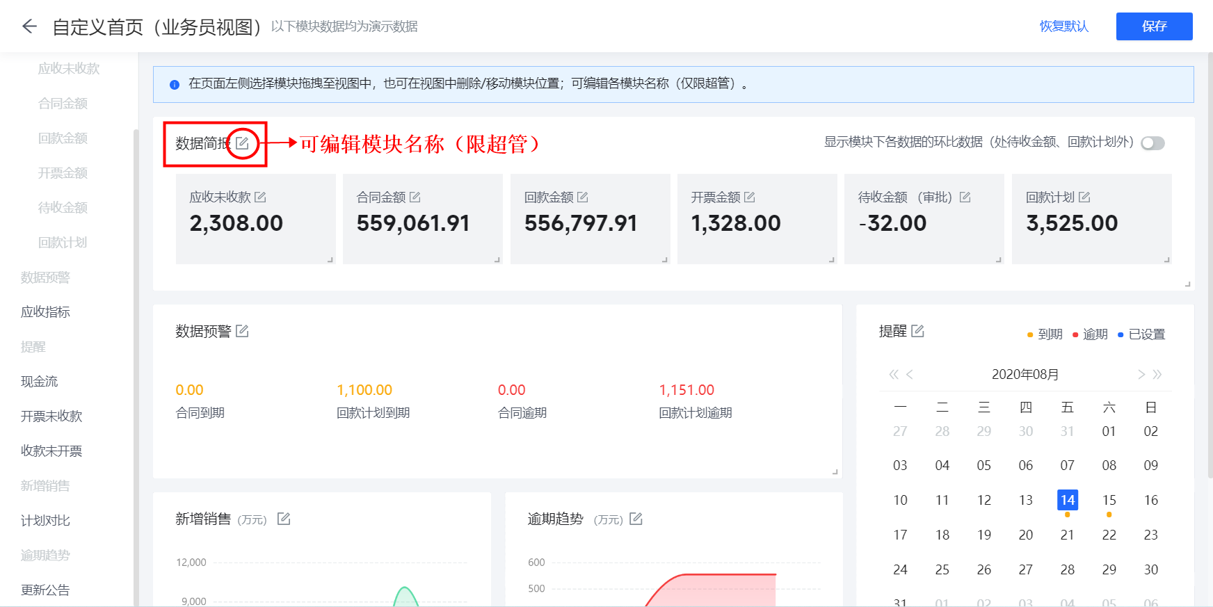 4、编辑模块的名称:超管角色可以点击模块标题旁边的编辑符号,对各个模块进行重命名。