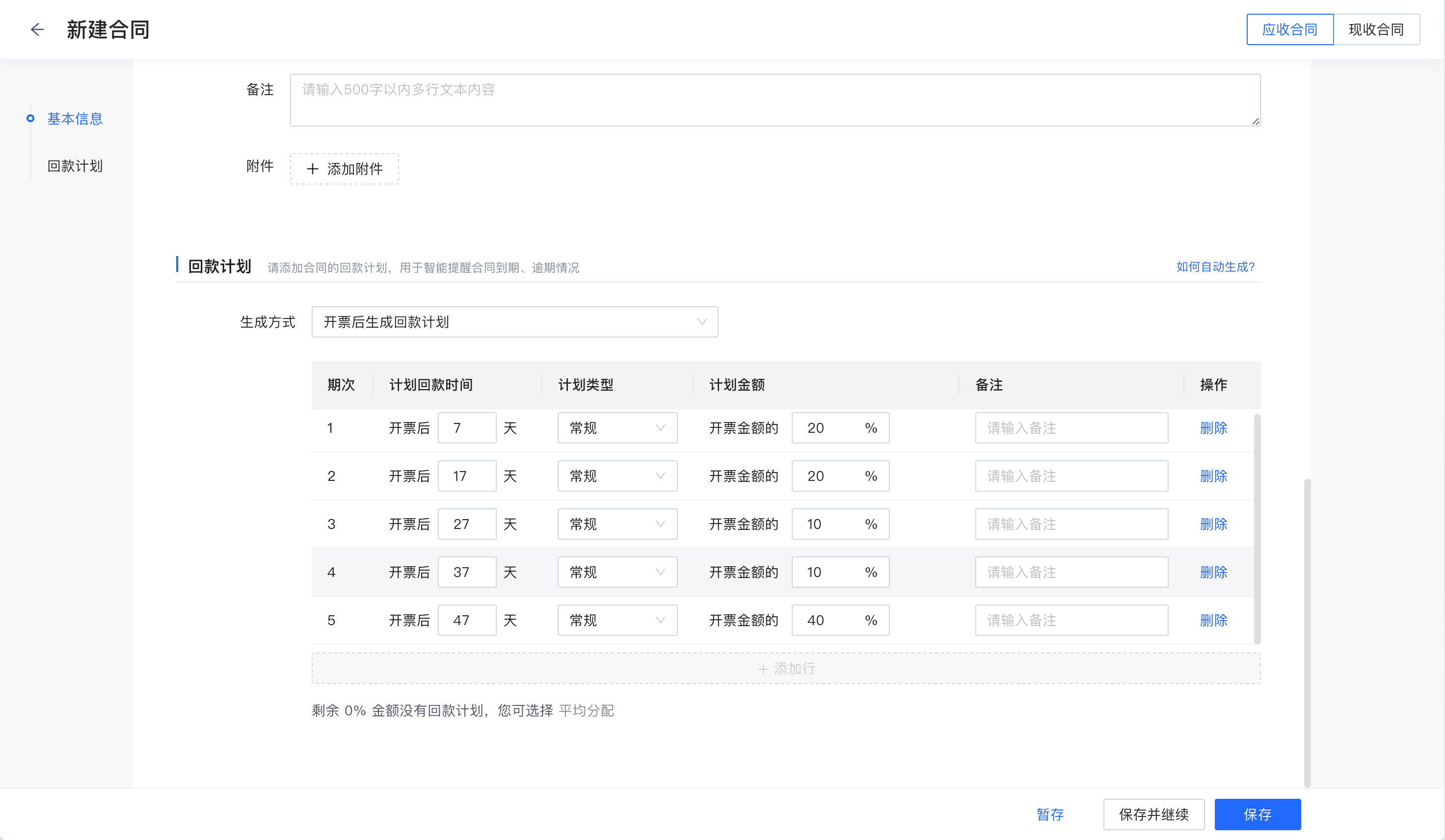 在账款管家内录入合同时,系统可根据付款约定自动生成回款计划,清晰展示回款进度,实时把控回款计划,应收账款一目了然。