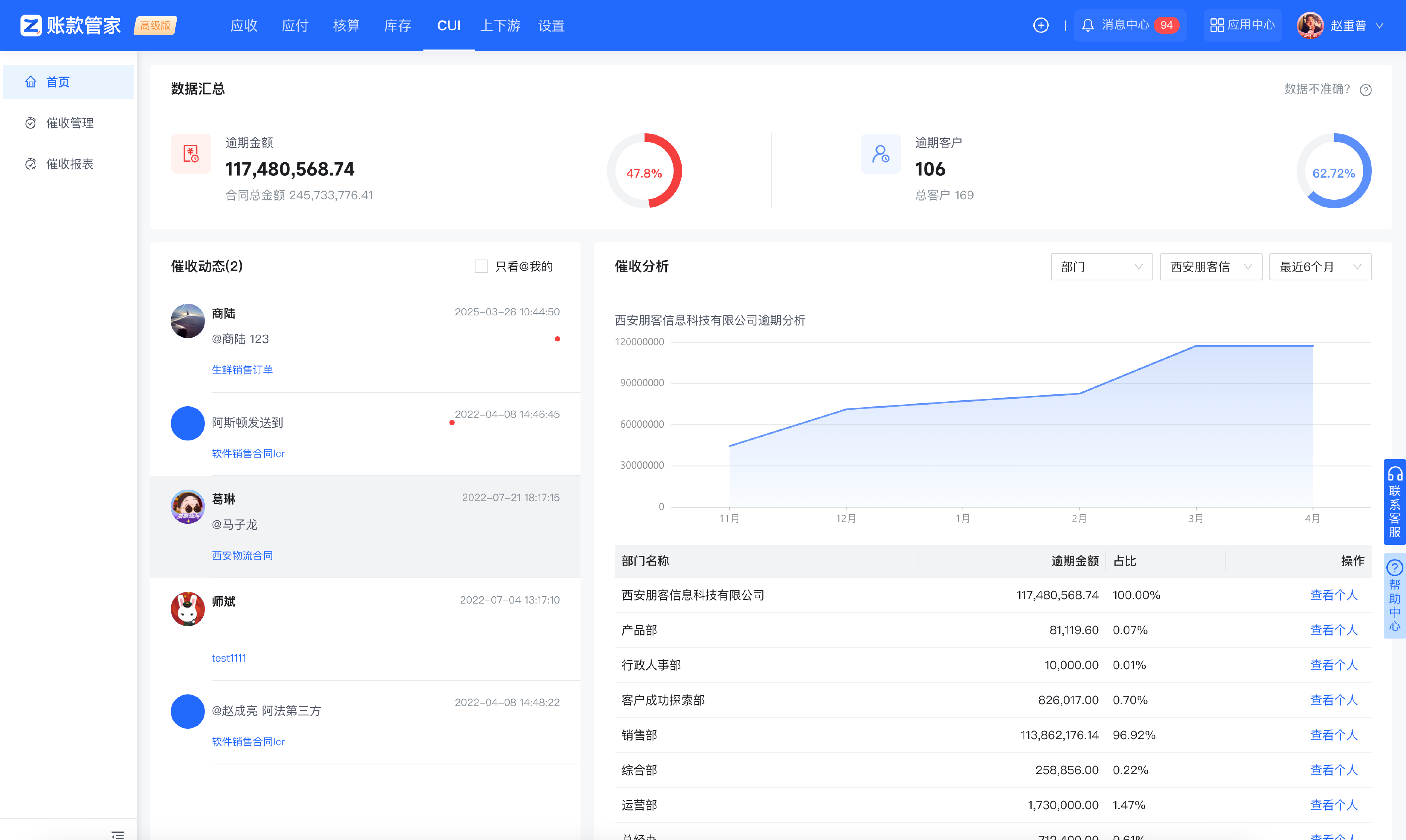 账款管家对于到期、逾期的回款计划可通过数据预警、日历提醒、消息提醒的功能,第一时间让跟进人了解到应收账款状况。同时,智能催收功能,对内催员工,对外催客户,对内可通过账款管家消息系统、钉钉消息等形式,进行内部催收,并同步催收动态;对外以短信、邮件的形式,对客户发送催收信息,并进行催收动态记录。