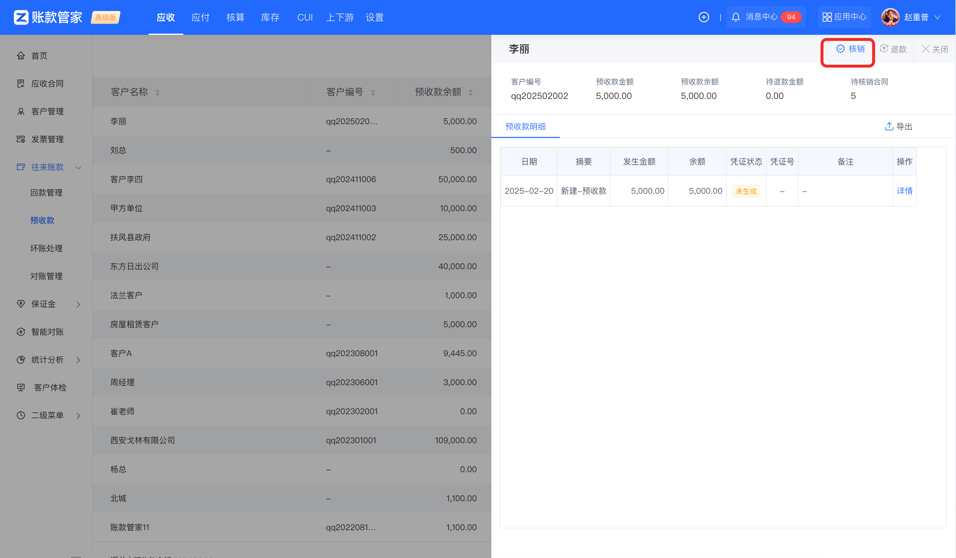可以在账款管家中录入预售款信息,在后续业务发生时,将预收款核销到对应的合同中,如果交易取消,预收款也可以退回,不仅能降低企业的资金压力,还能有效控制坏账风险。