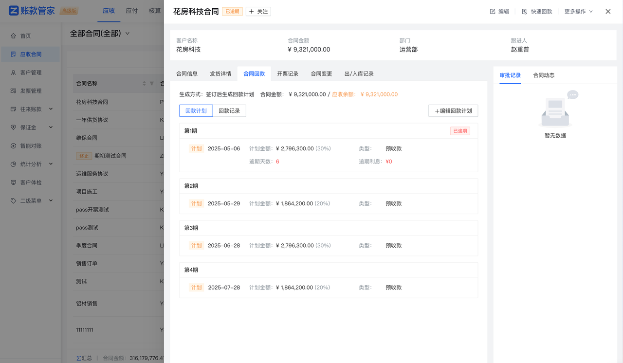 在录入合同时,可以根据双方约定条件、客户情况,灵活设置不同回款计划、回款方式和账期,系统可自动生成每期应收金额与收款日期。并设置自动化审批流程,确保所有合同都经过严格审核。