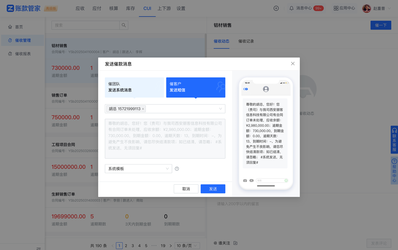 🔸对外:基于账款管家数据,设定短信内容模板,对客户发送催收信息,并进行催收动态记录。